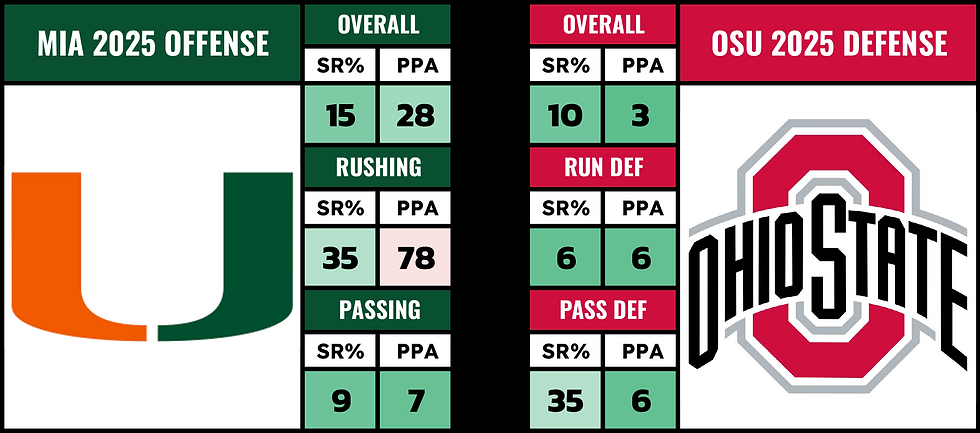 Miami's offense couldn't do anything against Texas A&M's defense. Now this was at Kyle Field instead of a neutral site... but still, Ohio State's defense is a step above Texas A&M's in my opinion. Mark Fletcher Jr. had 172 yards rushing in this game... very seriously doubt the run's gonna be there against Ohio State.