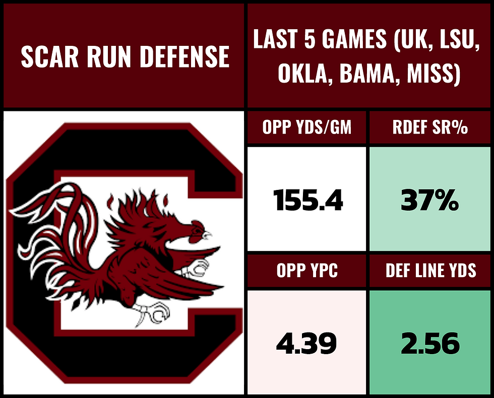 But South Carolina has been strong against the run... Remember A&M is still missing LeVeon Moss. Where South Carolina has struggled is against QBs who drop back and make throws from the pocket... that's not exactly what Texas A&M does.