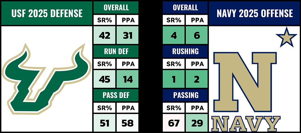 This is where it gets tough... cuz Navy played a lot of really bad defenses this year... really bad. Then last week, they went on the road to South Bend.... They were held in check. South Florida's defense is really strong... but it's not Notre Dame.