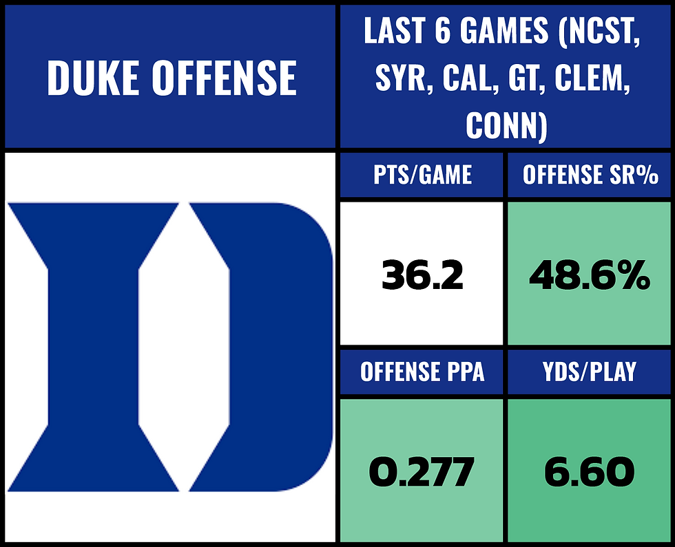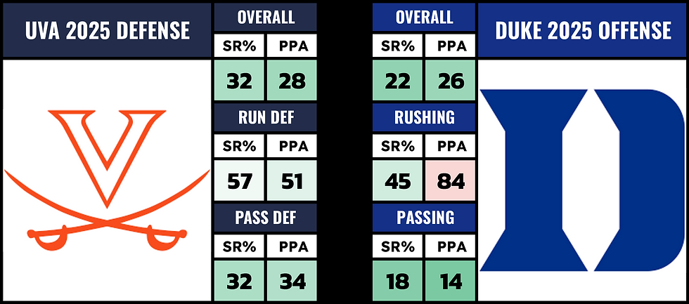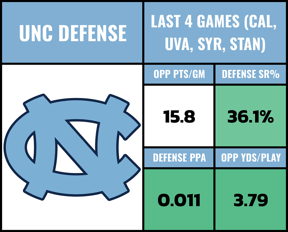 Look what UNC did to the last 4 offenses they saw. They're allowing 2.14 YPC. They might be getting CB Thaddeus Dixon back as well. He's missed all 4 of these games. WR Micah Mays Jr. is questionable. TE Eni Falayi returned last week.