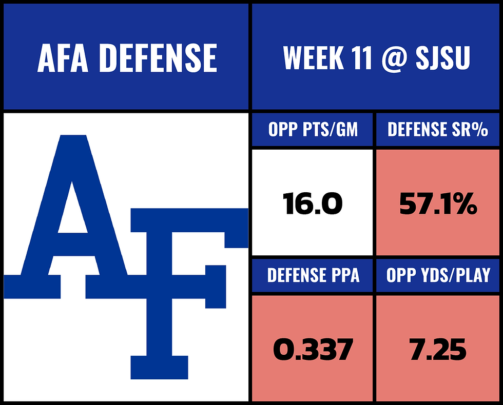 I know you might be thinking "Kyle the Air Force defense is playing better recently"... The final scores are a little deceiving. They did get DB Levi Brown back from injury so maybe they're slightly better. But keep in mind... San Jose State turned the ball over 3 times in the game. Air Force was not really making stops.