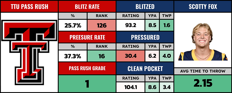 You would think the fact that the ball's out of Scotty Fox hands immediately would be a positive... neutralize Texas Tech's pass rush. But Texas Tech doesn't blitz. So sure, the ball's out of Scotty Fox's hands quickly but Texas Tech defenders should be making the tackle immediately.