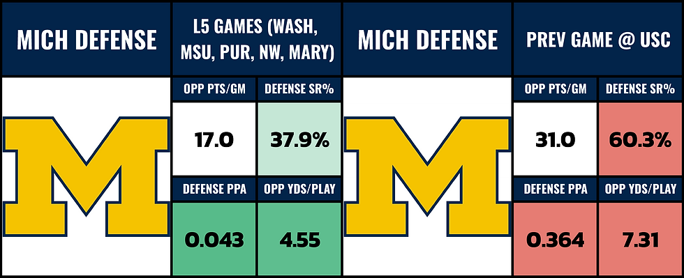 Michigan's been lights out defensively, but I do have to question the strength of opponents here. The only dangerous offense on here is Washington and they were missing two offensive linemen in that game. Regardless, still not comparable to Ohio State. The last time Michigan saw an offense comparable to Ohio State would be Week 7 @ USC and they got absolutely smoked in that game.