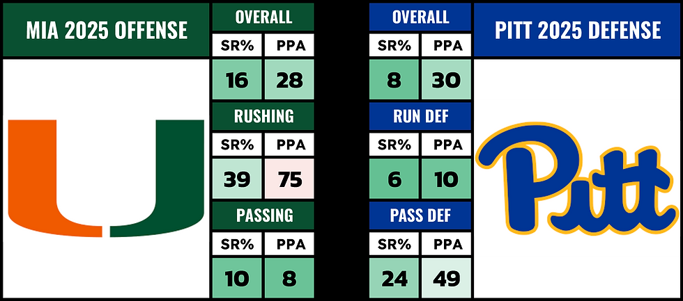 So can we trust Miami to move the ball against this Pittsburgh defense? Running the ball is gonna be a challenge. Pitt has one of the best run defenses in the country. This Miami offense is getting their RB1 and WR2 back though. Mark Fletcher Jr. is back (only missed 1 1/2 games). CJ Daniels is back also. He hasn't played in over a month. Pitt's got their main 2 guys back also though. LBs Rasheem Biles and Kyle Louis were both injured and have both been back. DT Sean FitzSimmons is most likely gonna miss his 2nd game though.
