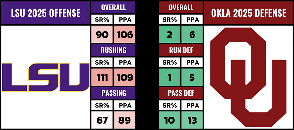 It's the other side of the ball... this is where I think LSU can really put up a fight here. LB Whit Weeks is finally back. Star CB Mansoor Delane is back. And Oklahoma's C Jake Maikkula is out for this game. He's one of the 2 offensive linemen that have been healthy all year. This is already an offensive line that's dealing with injuries (starting LG).