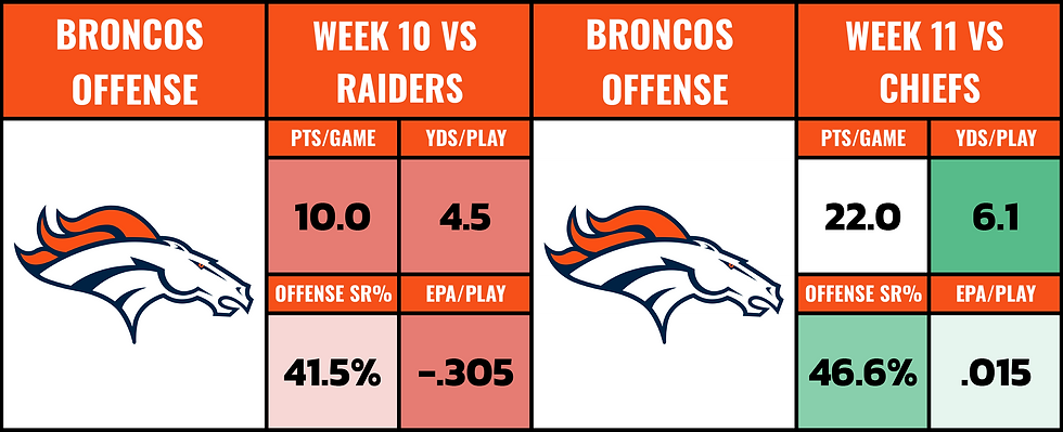 The Broncos are missing a center... and the run game hasn't been excellent. But they've seen some tough defenses and were still able to move the chains on the ground.
